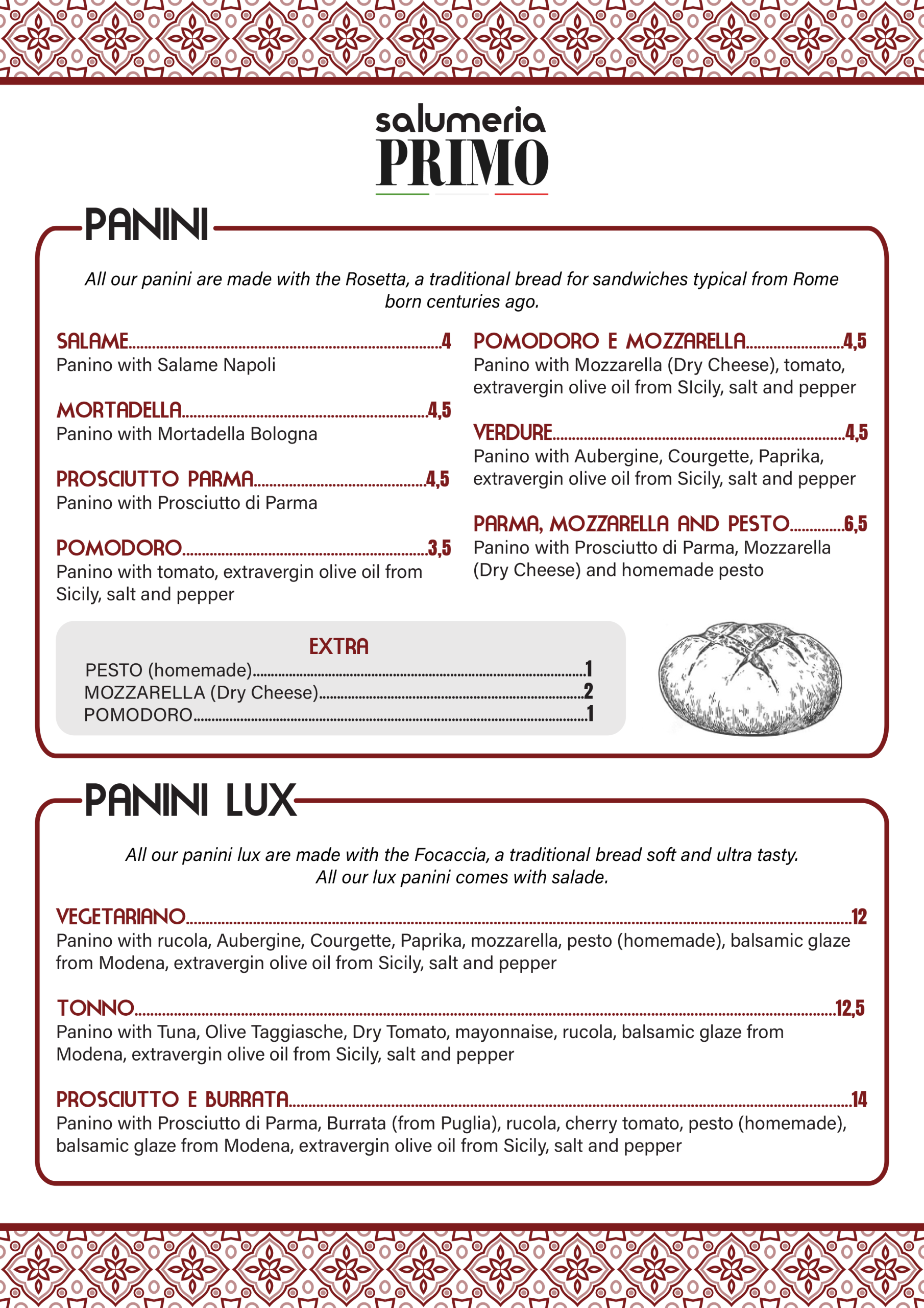 Our menu celebrates the simplicity of Italian sandwiches. From classic panini made with traditional Rossetta bread to our panini Lux on soft focaccia, everry recipe is prepared with carefully selected Italian ingredients.