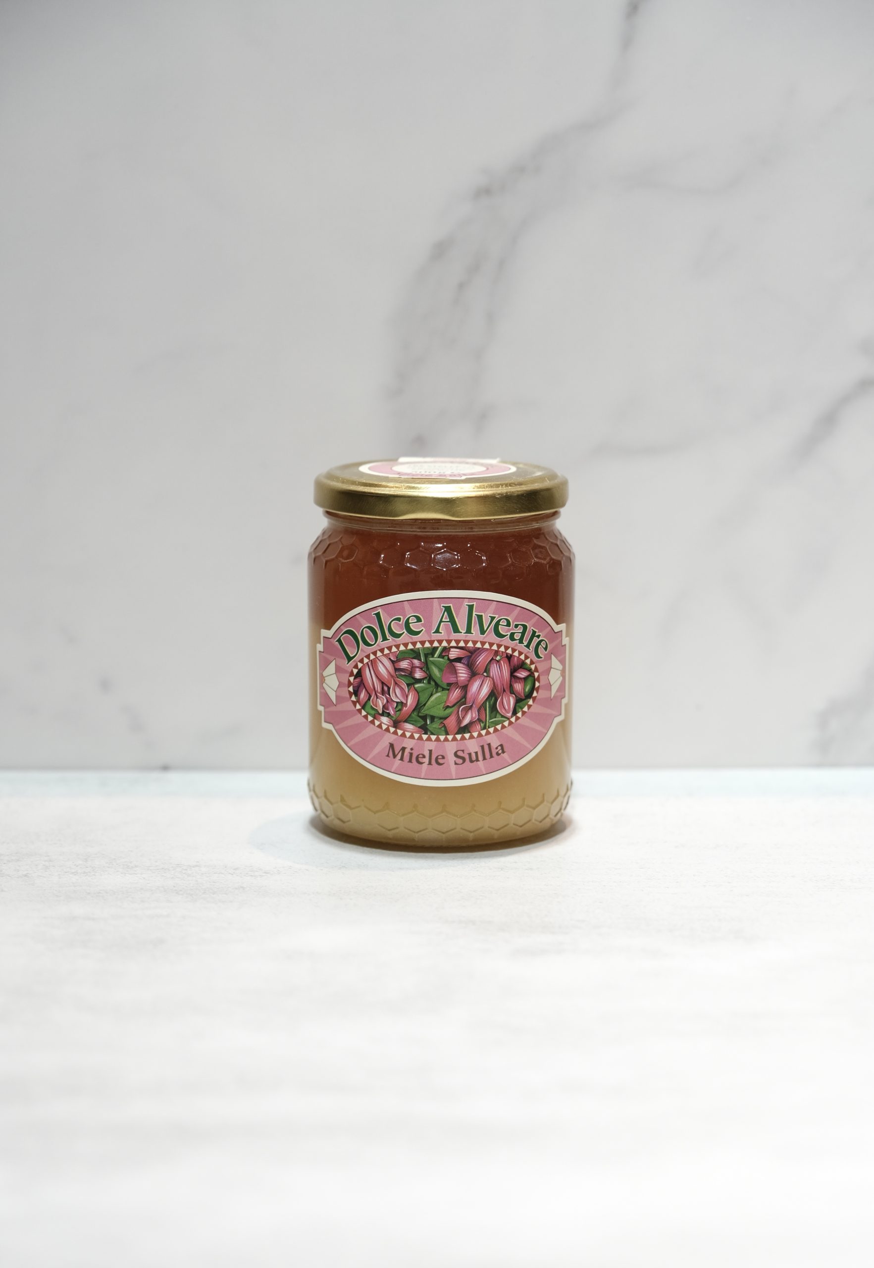 A jar of Italian honey produced from the nectar of Sulla flowers