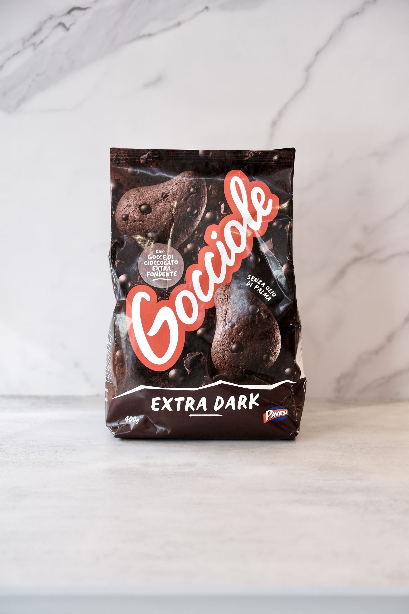Friable cocoa shortbread biscuits enriched with extra dark chocolate drops for an intense flavor